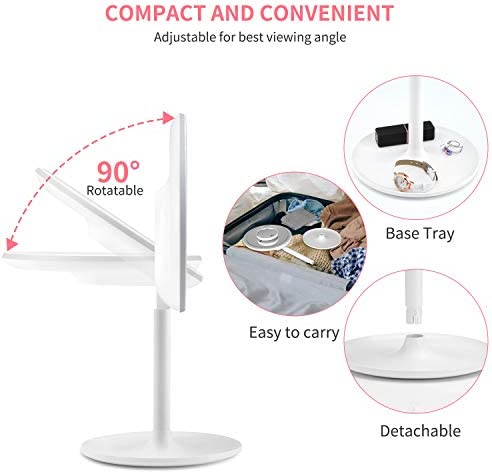 Customized designing: Detachable stand for portable and traveling designing, the round storage tray on stand for containing your lipstick, eyebrow brush, eyelash brush, facial cotton pad, mask, earrings, rings. 1-year quality guarantee for this makeup mirror with lights will be offered, any questions and advice are warmly welcomed and a satisfactory solution will be provided