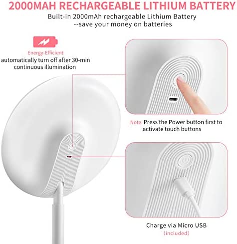 2 Powering modes: The ring light mirror built-in rechargeable 2 to 3 hours operation 2000mAh lithium battery, so convenient for travelling. USB operated makeup mirror, by USB cable connecting to power from USB adapter, power bank or laptop. NOTE: POWER ON the mirror by pressing the Power button on the back of the mirror to activate the touch button