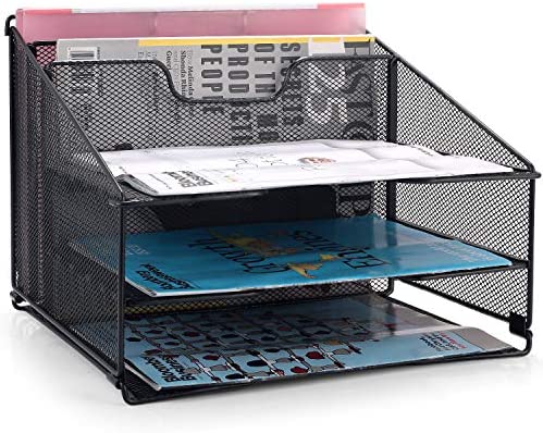 The three-tier paper tray and two vertical file shelves have a beautiful A4/letter size paper, documents,notepad, book, mailbox contact, files, folders and additional items such as stapler, tape, sticker, etc.